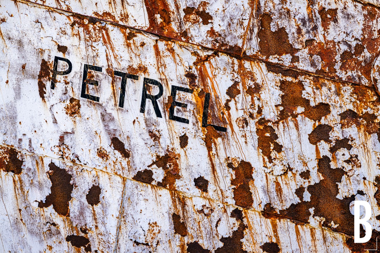 Detail van een oud veroest schip in de haven van Grytviken.