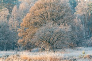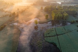 Natuurgebied de Kalkense meersen op een mistige najaarsochtend gezien vanuit de lucht.