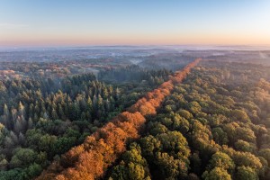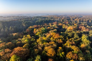 Het kleurrijke Zonienwoud gezien vanuit de lucht op een mistige najaarsochtend.