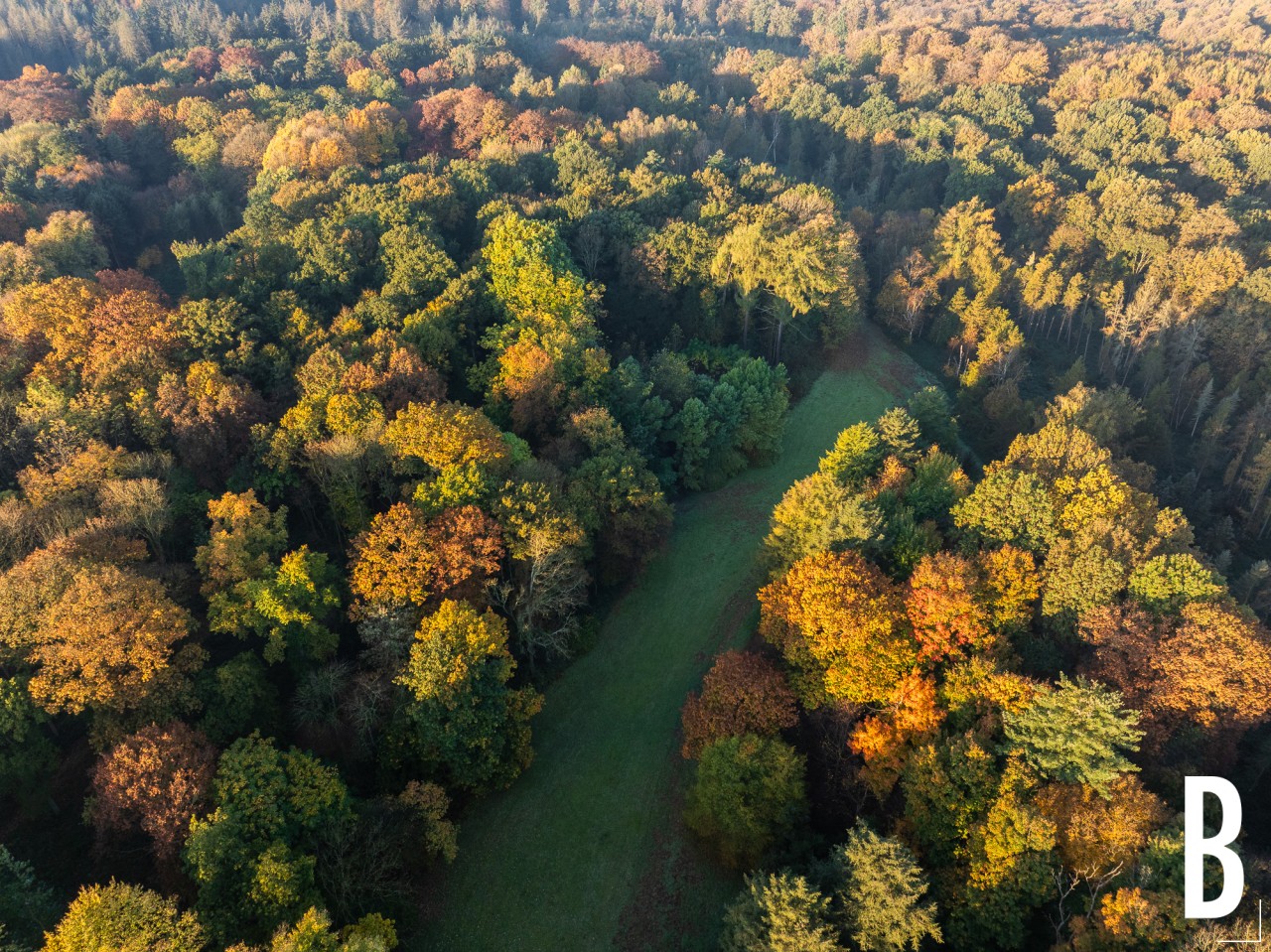 Het kleurrijke Zonienwoud gezien vanuit de lucht op een mistige najaarsochtend.