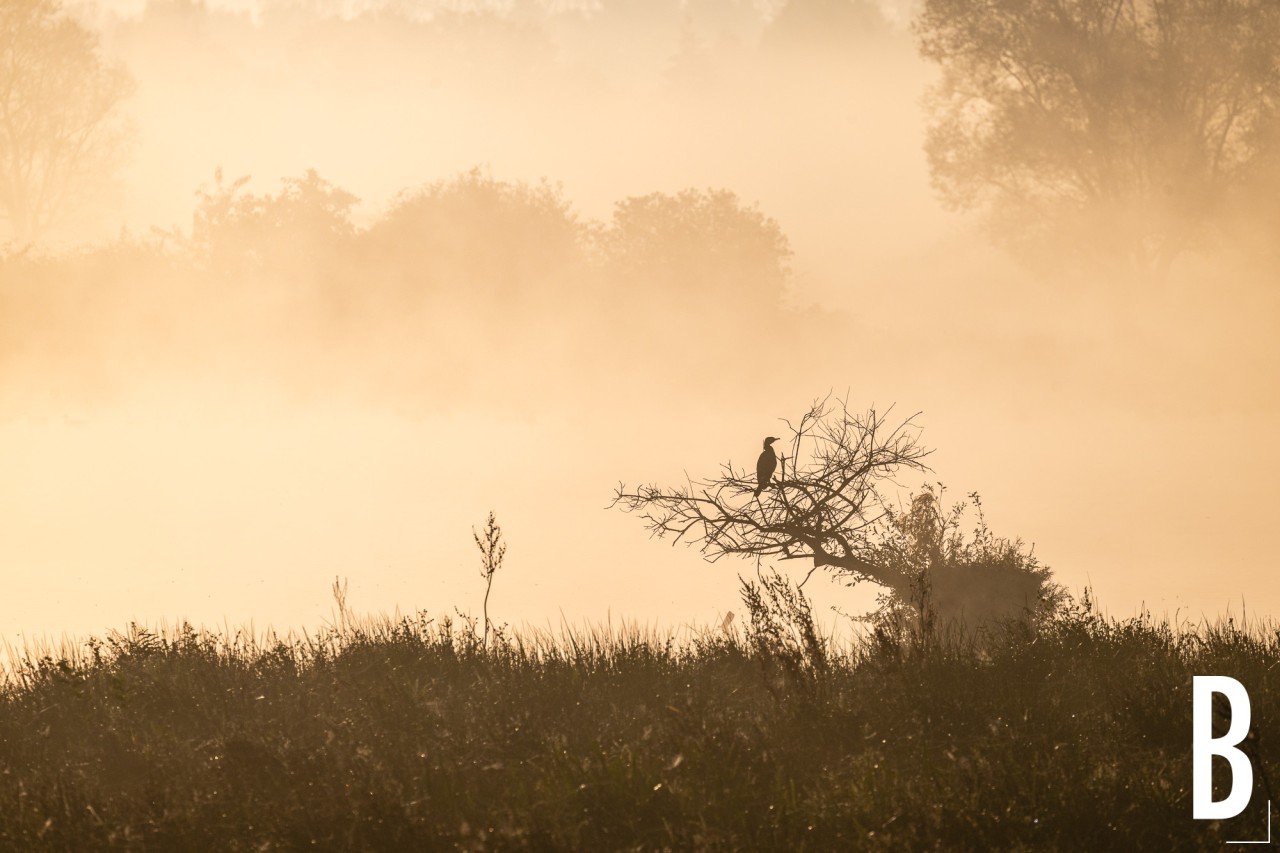 Aalscholvers rustend in een boompje aan de oevers van een vijver in het mechels broek op een mistige ochtend.