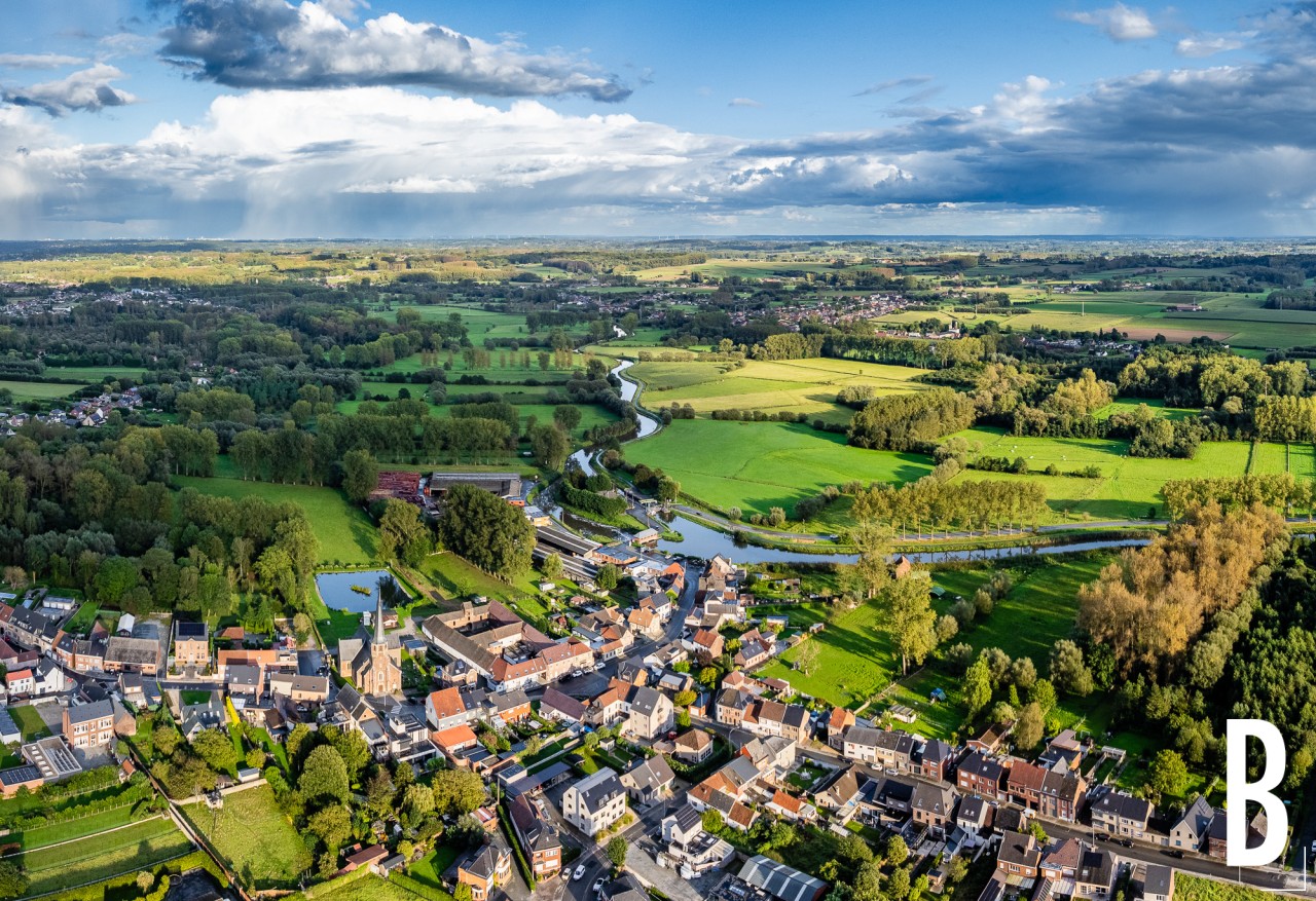 Een sfeervolle luchtfoto van de Dendervallei in Oost-Vlaanderen, België, toont de Vlaamse Ardennen bij wisselvallig weer. Dramatische wolkenformaties werpen schaduwen over het glooiende landschap rond Geraardsbergen.