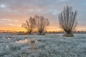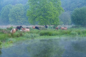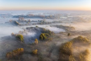 De natte Demerbroeken op een mistige zomerochtend gezien vanuit de lucht.