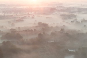 De natte Demerbroeken op een mistige zomerochtend gezien vanuit de lucht.