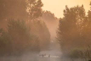 Een statige oude wilg in tegenlicht op een mistige ochtend in natuurreservaat het Paddenbroek.