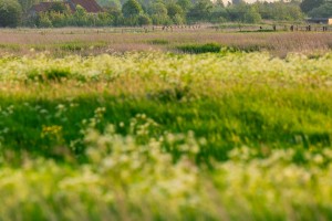 Kleine zilverreigers fourageren in een nat weiland in de Uitkerkse polder vol met witte bloemen van waterranonkel.