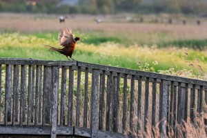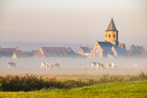 Kleine zilverreiger fourageert in een nat weiland in de Uitkerkse polder vol met witte bloemen van waterranonkel.