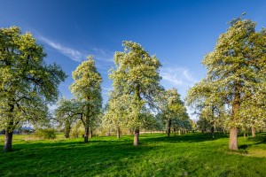 Zicht op het bocagelandschap van de Vlaamse Ardennen gezien vanaf de uitkijktoren in Elst op een ochtend in het voorjaar.`