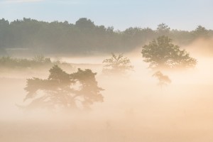 Het typische landschap van de Assebroekse meersen met talloze knotwilgenrijen en natte weilanden gezien vanuit de lucht op een mistige oechtend in het voorjaar.