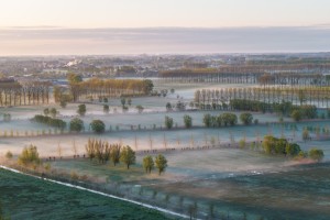 Het typische landschap van de Assebroekse meersen met talloze knotwilgenrijen en natte weilanden gezien vanuit de lucht op een mistige oechtend in het voorjaar.