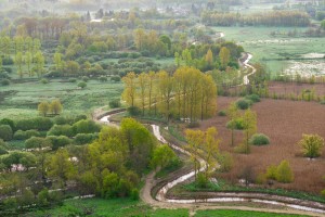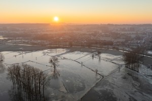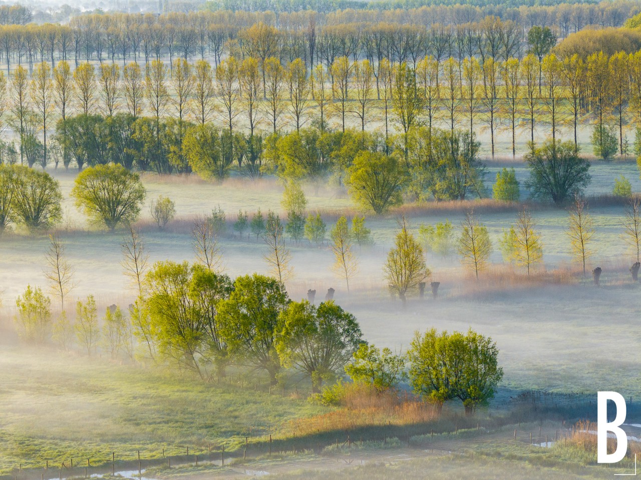 Het typische landschap van de Assebroekse meersen met talloze knotwilgenrijen en natte weilanden gezien vanuit de lucht op een mistige oechtend in het voorjaar.