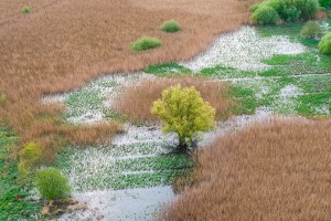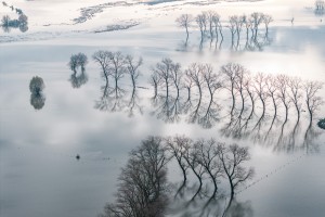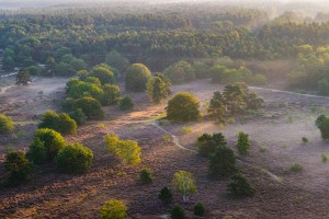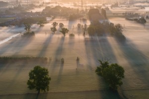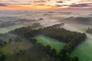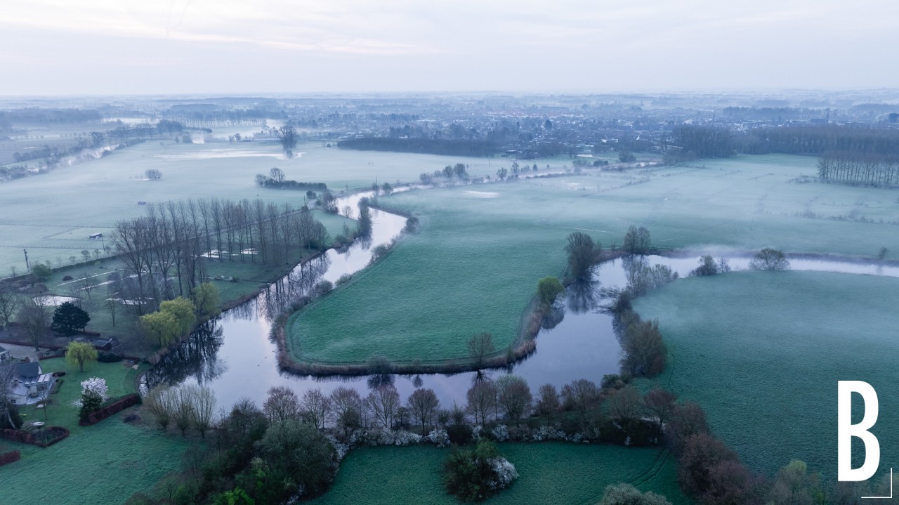 De Oude Leie, deel van Natuurpark Levende Leie, gezien vanuit de lucht op een mistige ochtend in de vroege lente.