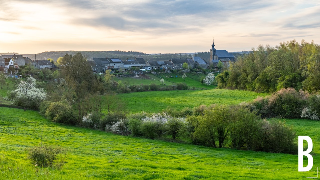Zicht op het dorpje Aublain dat bovenaan de heuvel prijkt. In de vallei zorgen bloeiende sleedoornstruiken voor witte accenten in het landschap.