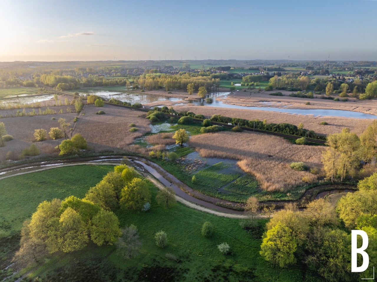 Moerasgebied de Demerbroeken gezien vanuit de lucht op op een mooie ochtend in het voorjaar. Het landschap kleurt prachtig door de variëteit aan frisgroene lentekleuren.