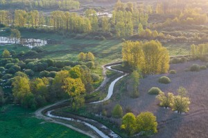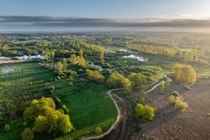 Moerasgebied de Demerbroeken gezien vanuit de lucht op op een mooie ochtend in het voorjaar. Het landschap kleurt prachtig door de variëteit aan frisgroene lentekleuren.