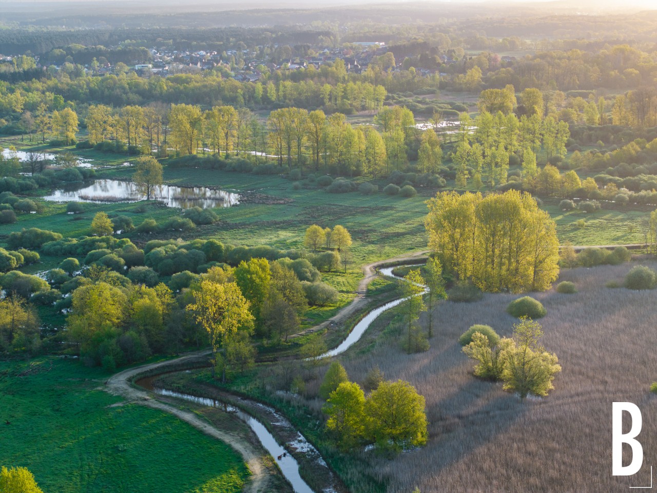 Moerasgebied de Demerbroeken gezien vanuit de lucht op op een mooie ochtend in het voorjaar. Het landschap kleurt prachtig door de variëteit aan frisgroene lentekleuren.