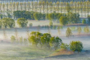 Moerasgebied de Demerbroeken gezien vanuit de lucht op op een mooie ochtend in het voorjaar. Het landschap kleurt prachtig door de variëteit aan frisgroene lentekleuren.