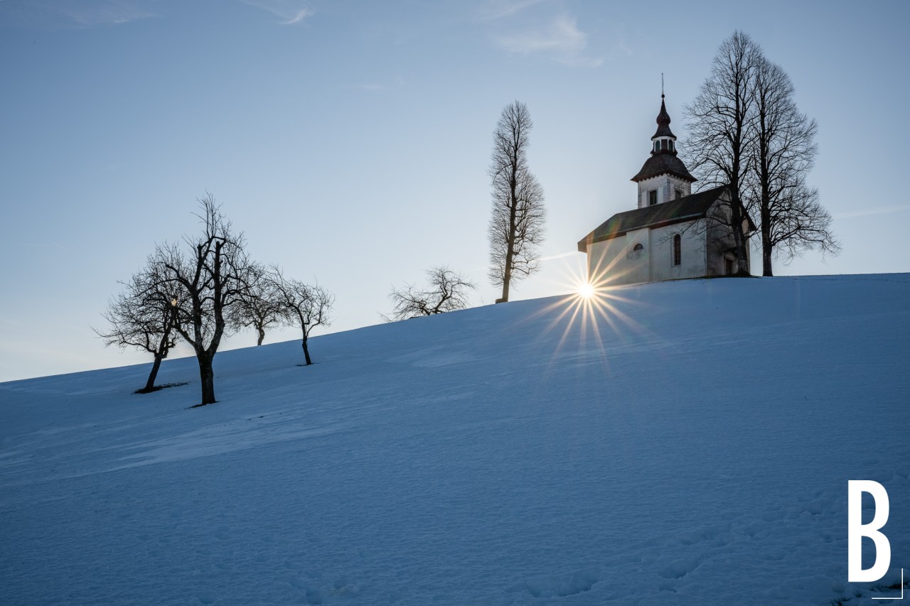 Het kerkje van Sveti Tomaž op een winterse ochtend.