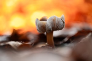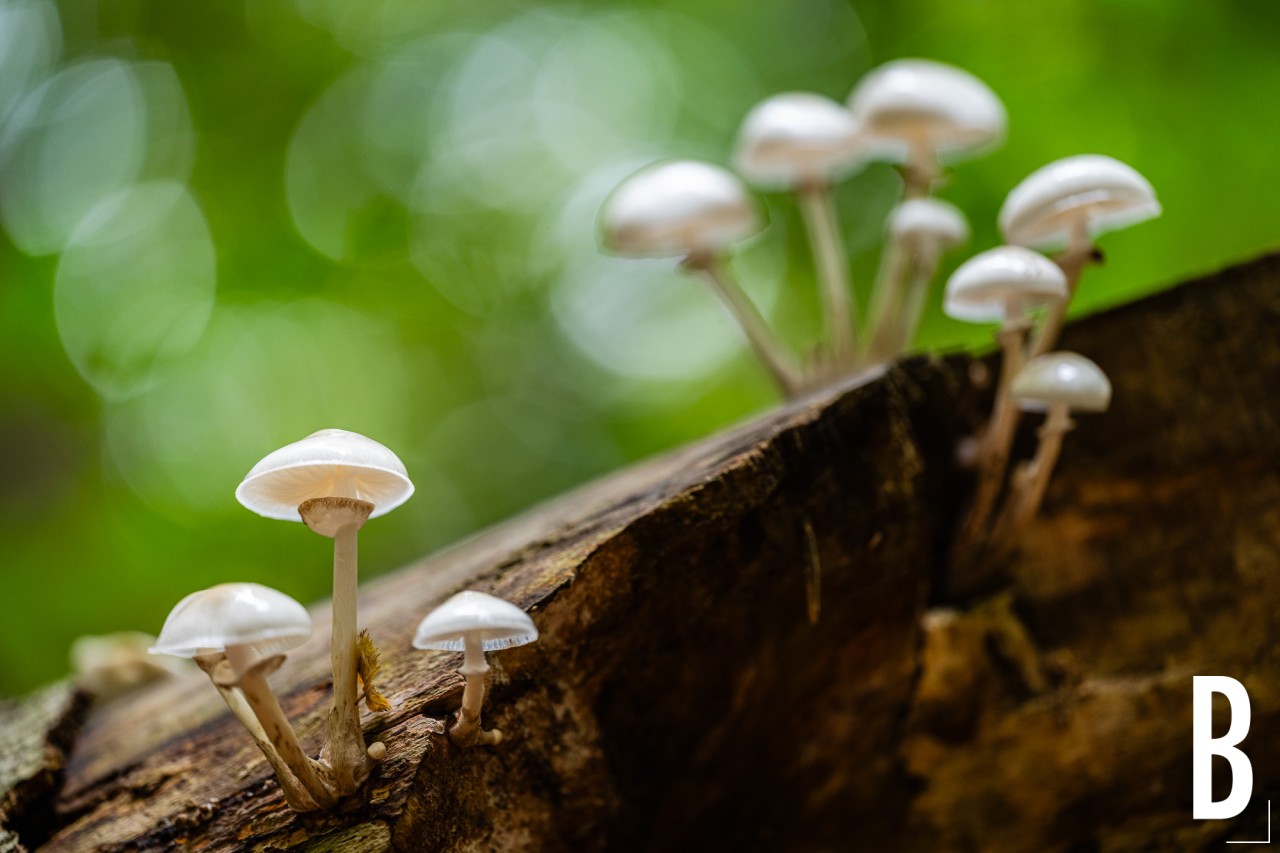 Detail van een porseleinzwam groeiend op een tak in het bosreservaat van Everbeek-Boven.