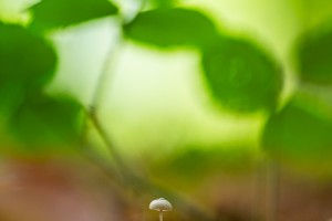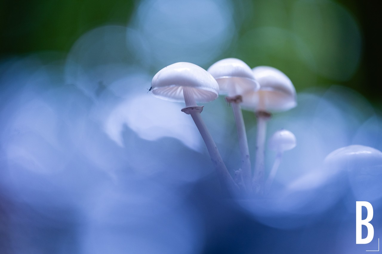 Detailopname van de glanzende, witte porseleinzwam (Oudemansiella mucida) in het Hayesbos.