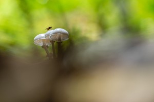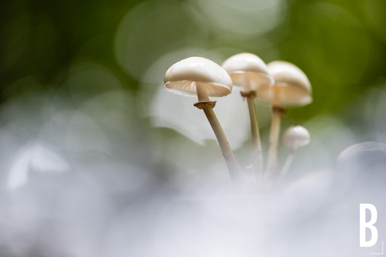 Detailopname van de glanzende, witte porseleinzwam (Oudemansiella mucida) in het Hayesbos.