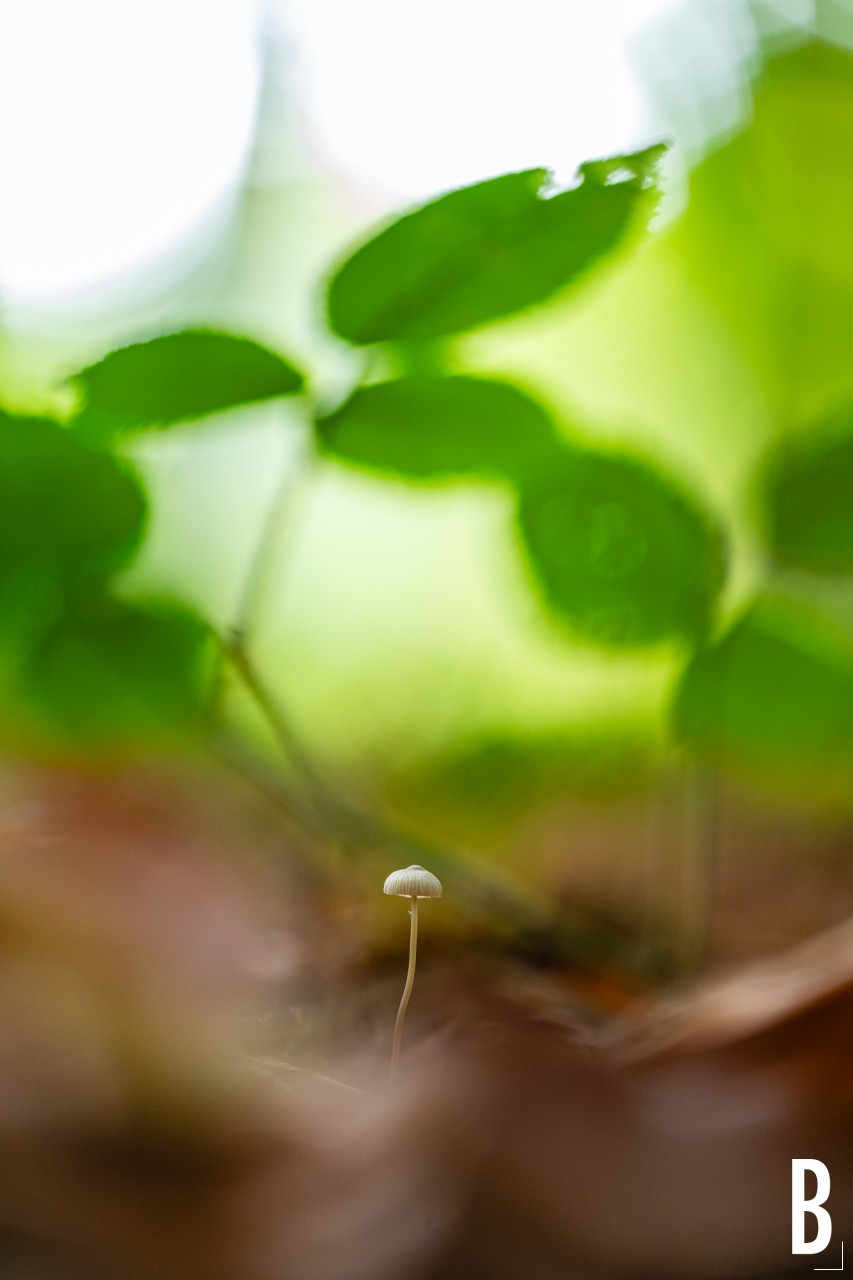 Detailopname van een fragiele Mycena tussen de herfstbladeren.