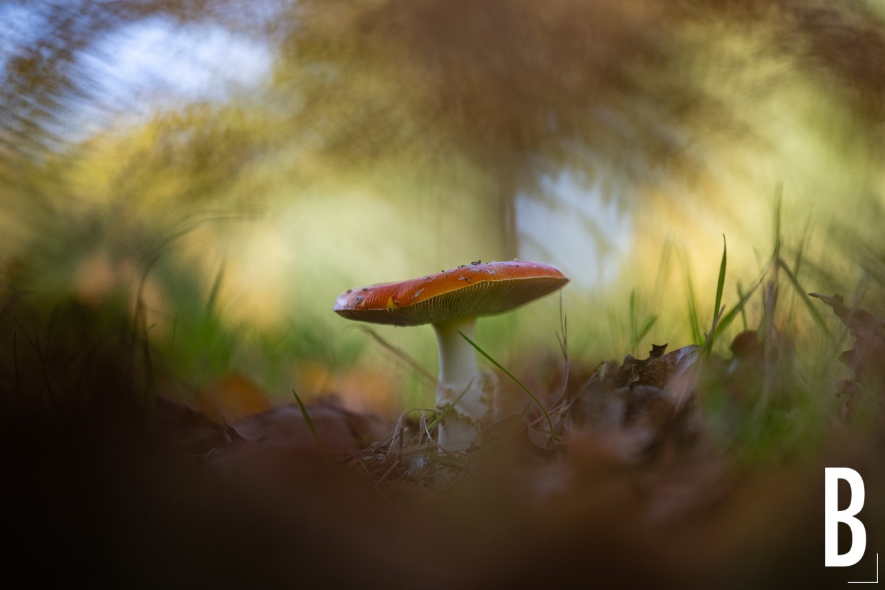 Karakteristieke rode vliegenzwam (Amanita muscaria) in het natuurreservaat Heidebos.