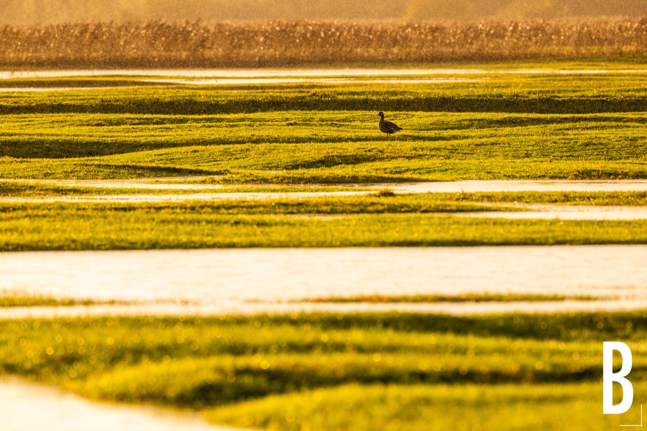 Een groep kolganzen (Anser albifrons) tijdens een bui in het natuurgebied De Blankaart.