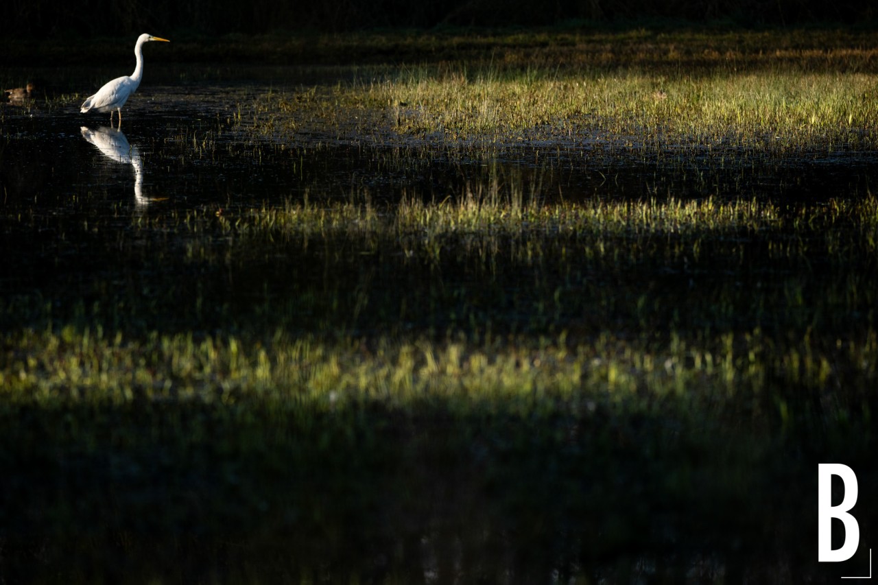 Zicht op een grote zilverreiger in het moeras van natuurreservaat bourgoyen-ossemeersen te gent.