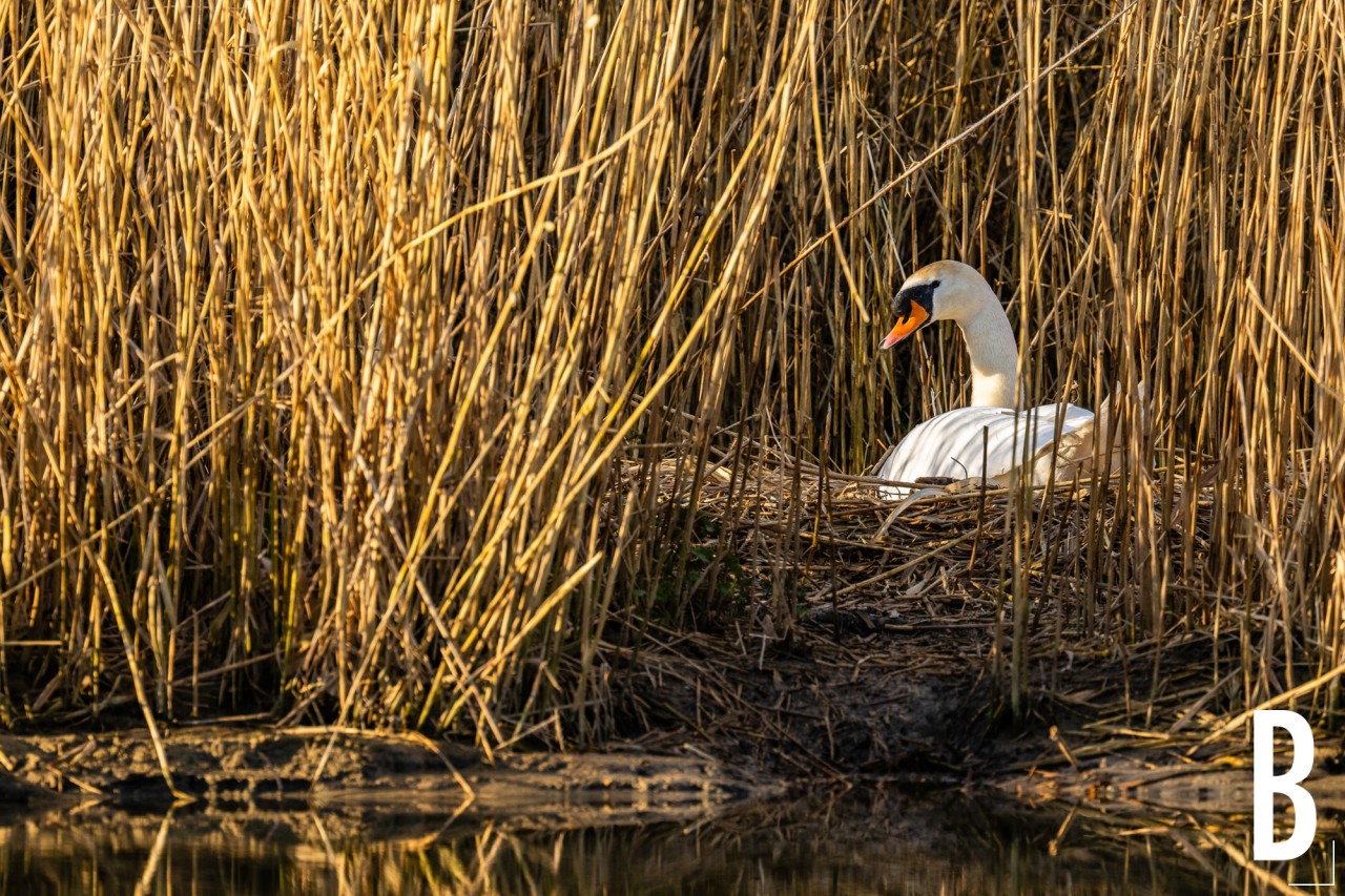 Knobbelzwaan op nest langs de oevers van de Dijle in het Wijgmaalbroek