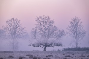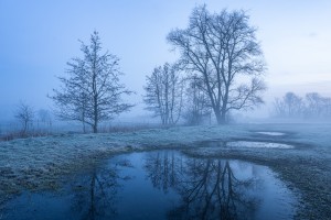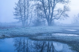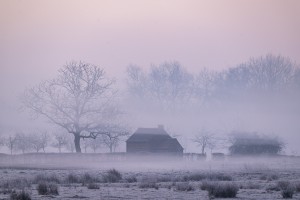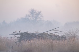 Zicht op een aalscholver in de mist over de meersen van natuurreservaat bourgoyen-ossemeersen te mariakerke.