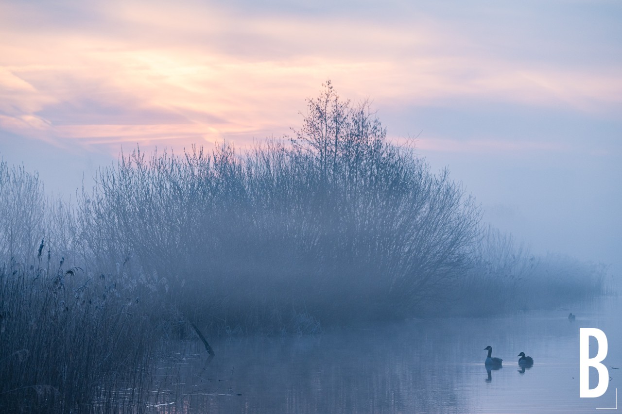 Zicht op de ganzen bij de gracht in de mist over de meersen van de bourgoyen-ossemeersen te mariakerke.