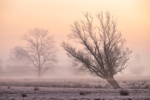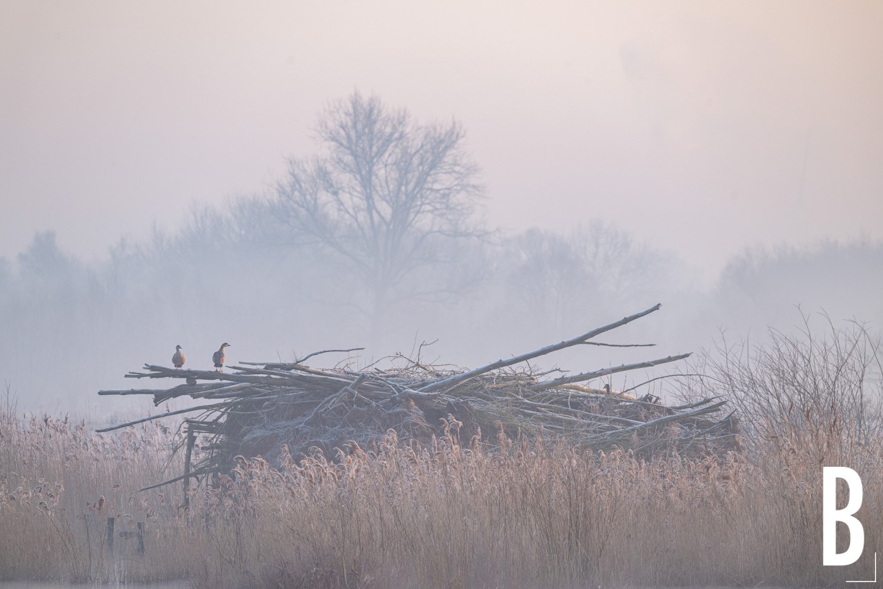 Zicht op ganzen in de mist over de meersen van natuurreservaat bourgoyen-ossemeersen te mariakerke.