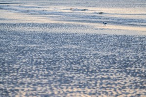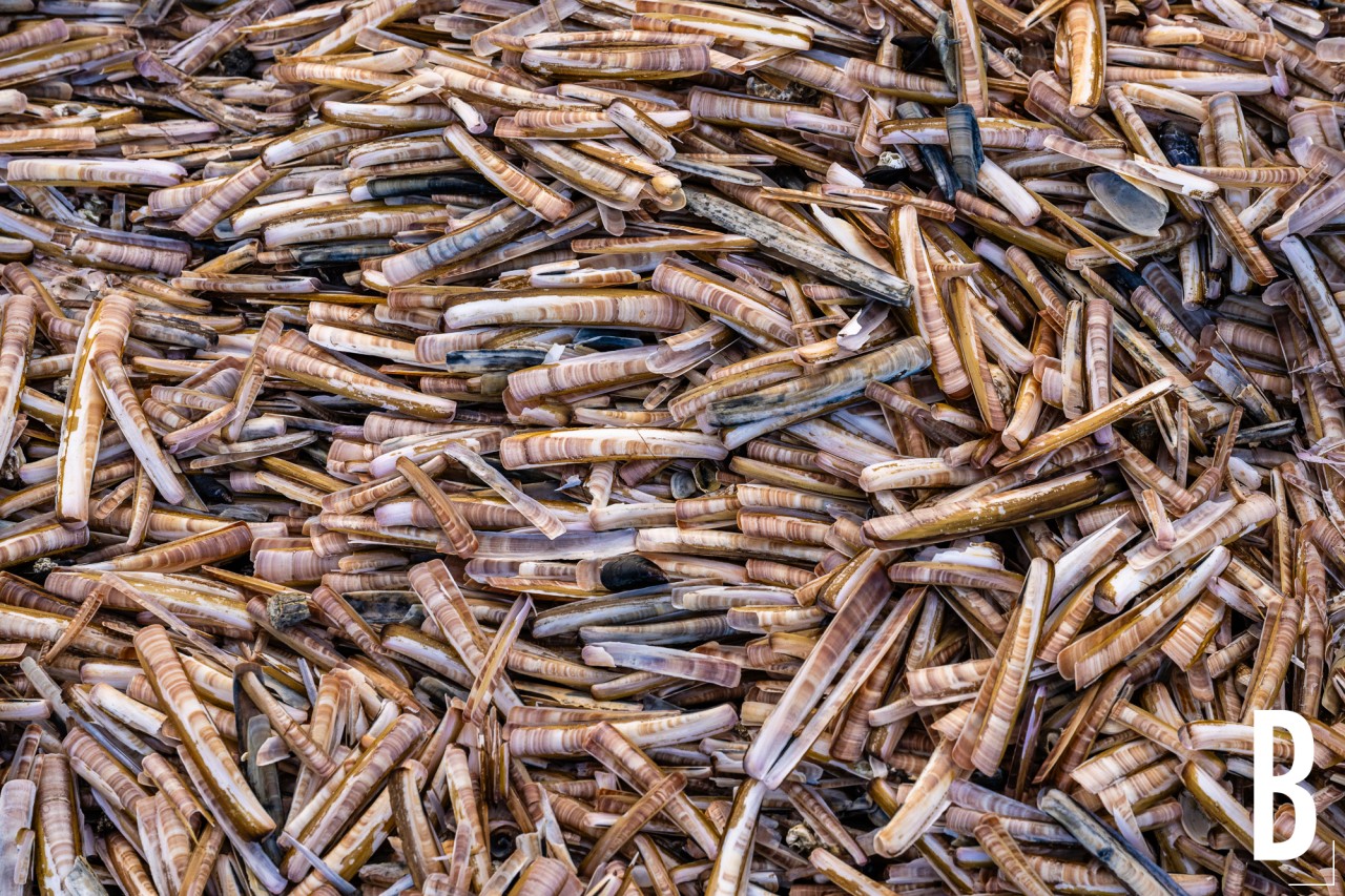 Aangespoelde scheermessen (Ensis) op het zand van de Belgische kust tijdens eb.
