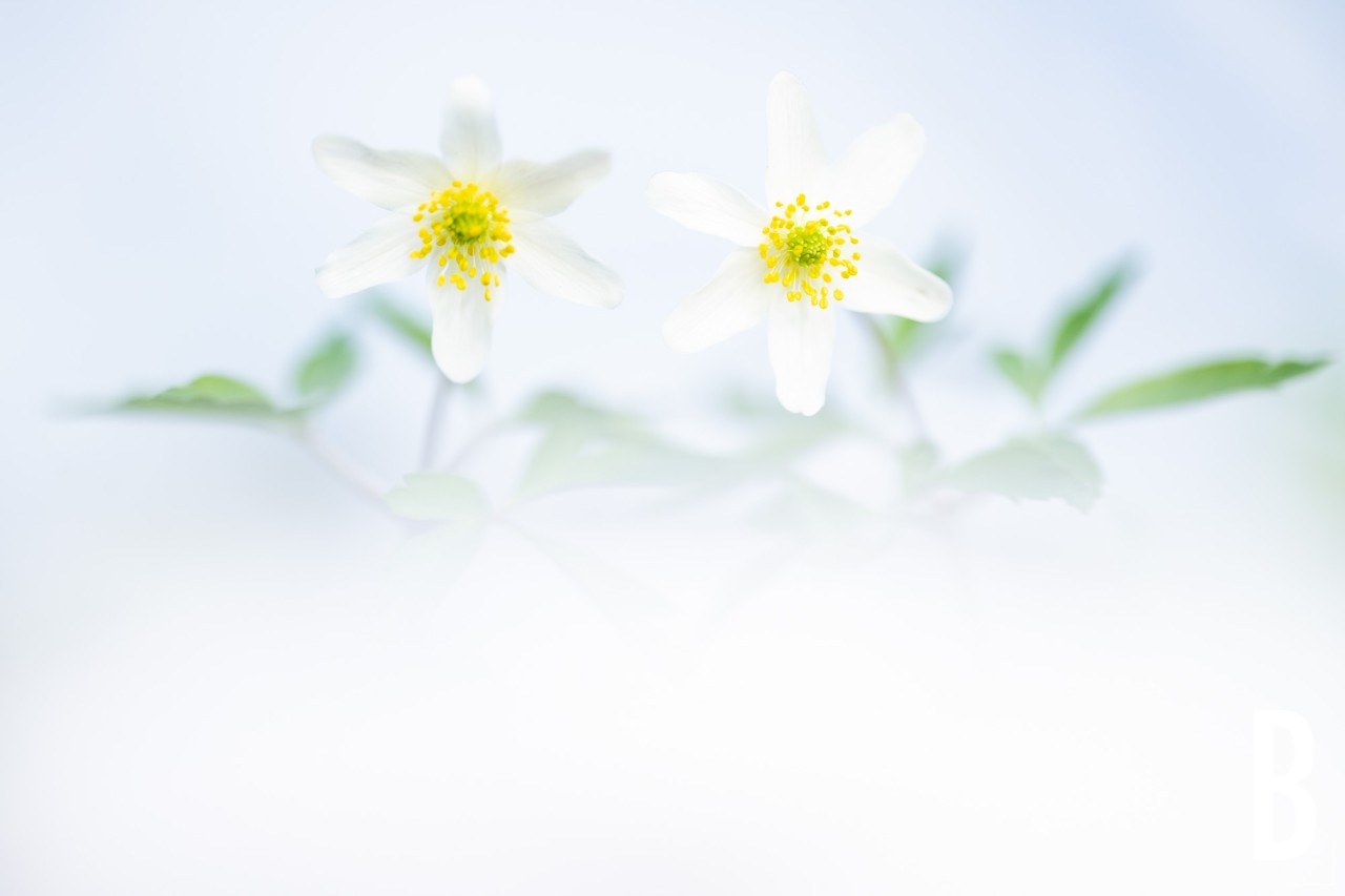 Artistieke opname van een bosanemoon op een witte achtergrond tijdens het voorjaar te brakel.