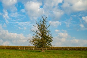 Een karakteristieke boom in het glooiende landschap van de Vlaamse Ardennen.