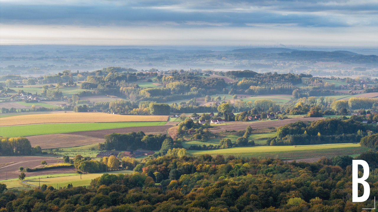Droneopname van de mysterieuze sfeer in het Brakelbos bij ochtendmist.