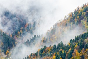 Herfstbladeren en sneeuw vermengen zich tijdens een mistige dag in de Vlaamse Ardennen.