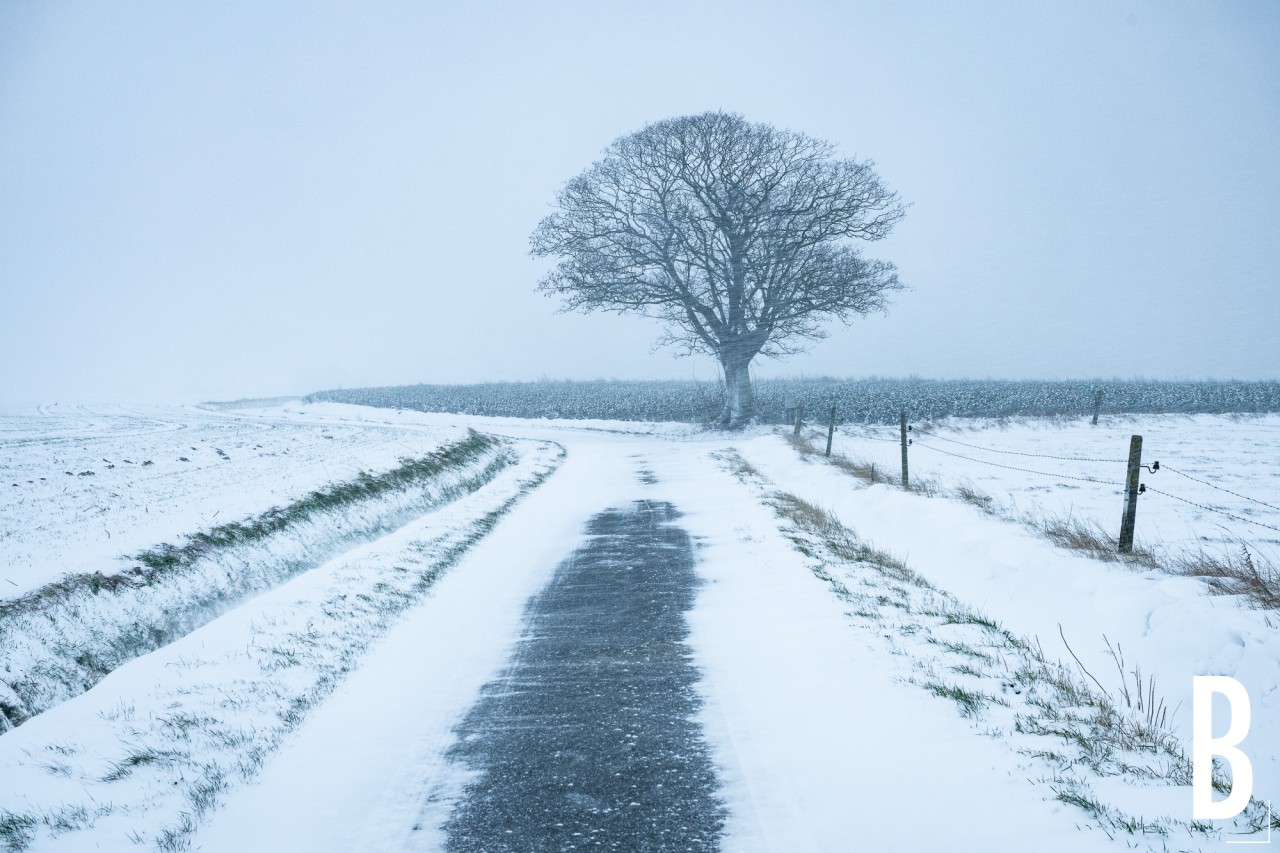 Een sfeervolle opname van de Ommelozen Boom op de besneeuwde Edelareberg.