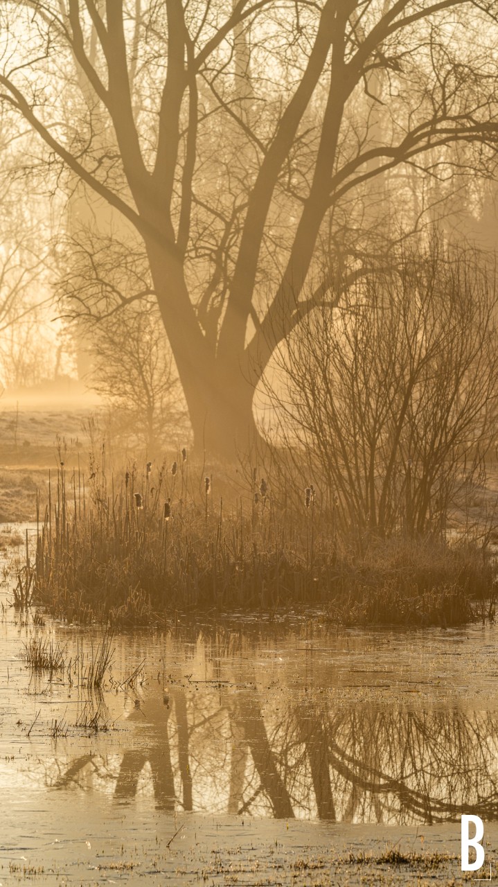 Zicht op een boom bij de beek tijdens de zonsopgang in de mist over de bourgoyen-ossemeersen te mariakerke.