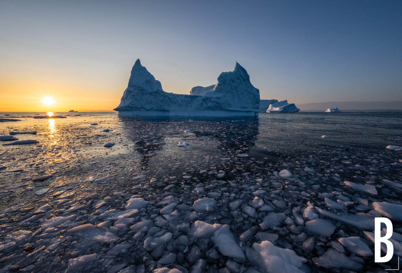 De zon zakt laag achter de ijsbergen, wat zorgt voor een warme gloed op het ijs.