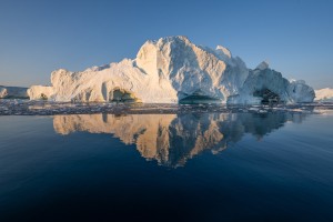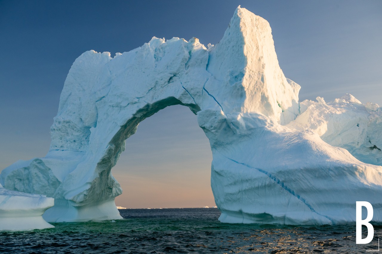 De laatste zonnestralen raken de toppen van de ijsbergen.