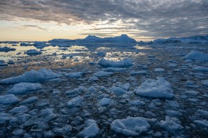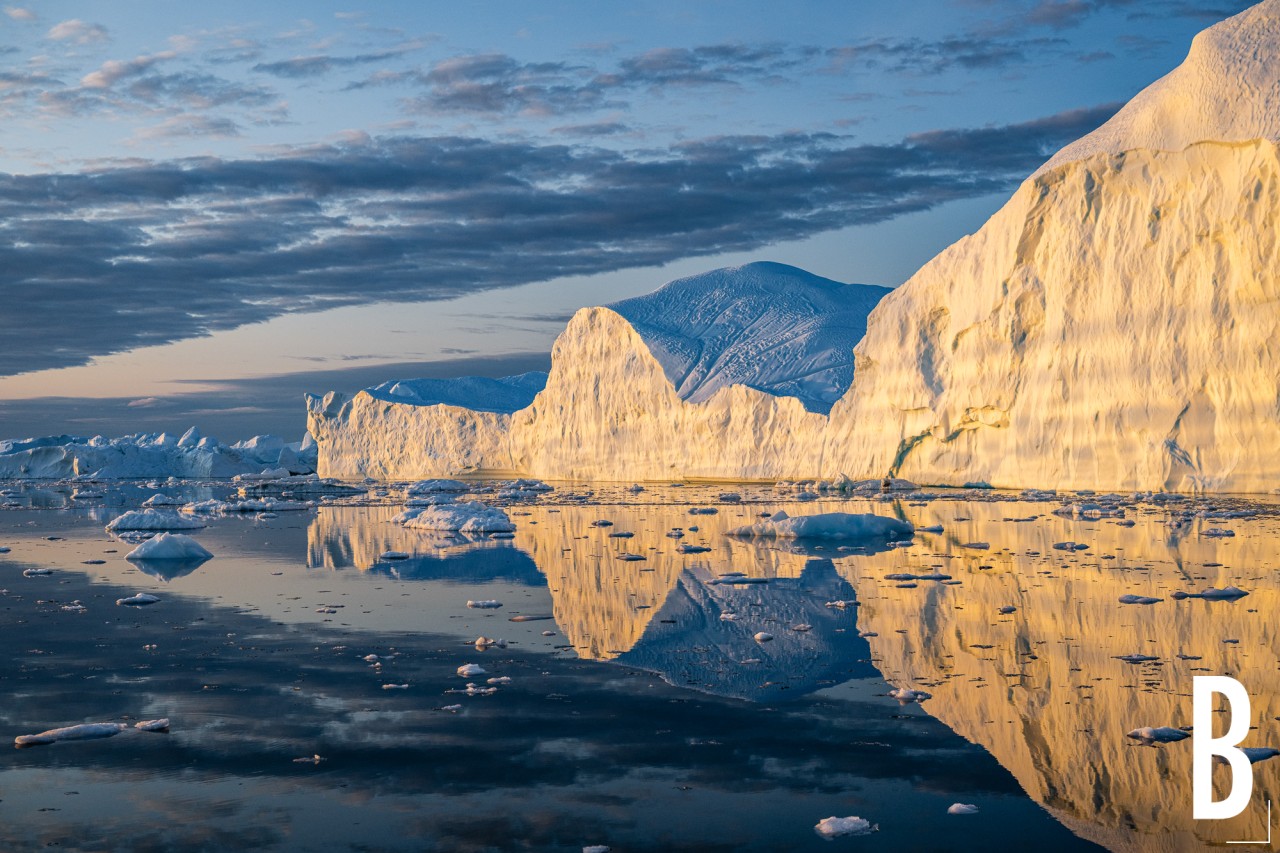 Zicht vanaf het water op de enorme ijsbergen in de zomer.