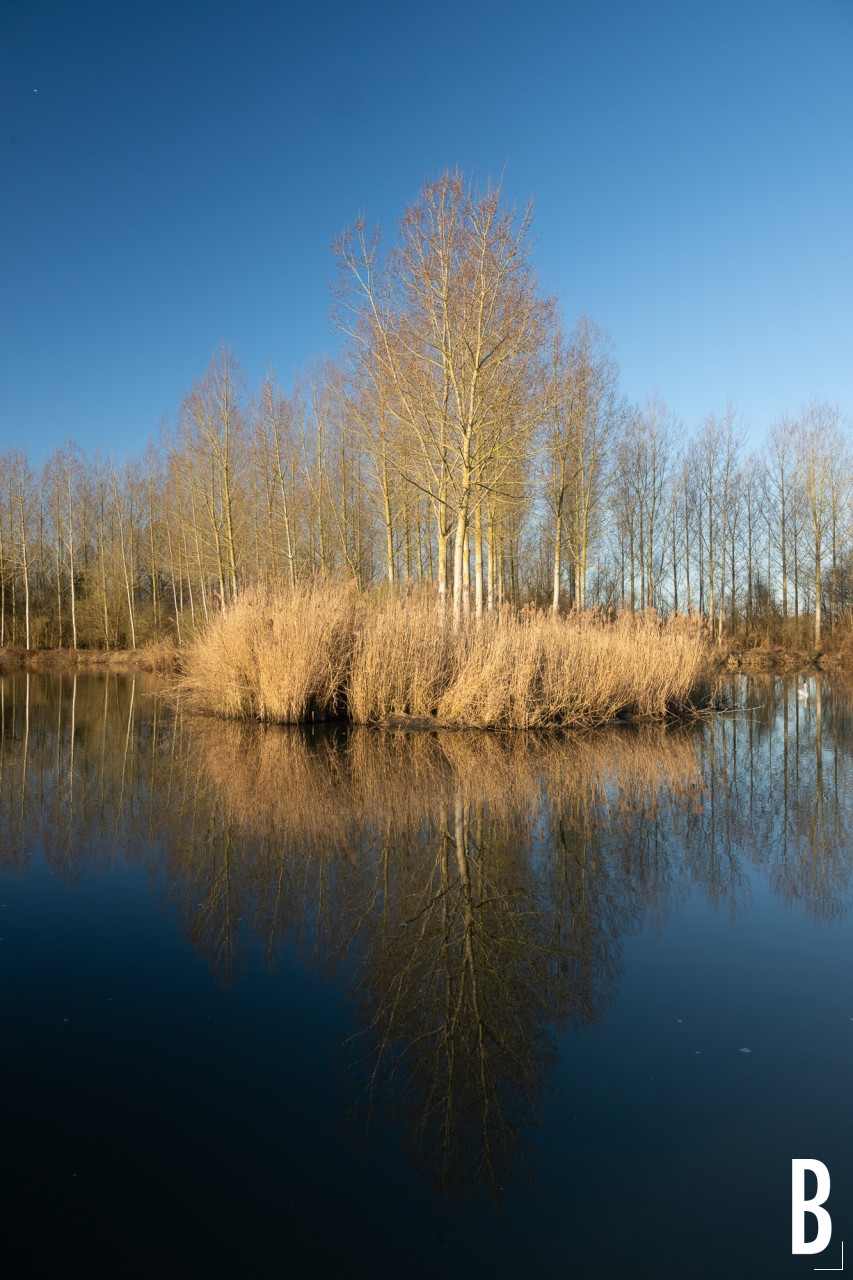 Zicht op de bomen en reflecties in het water van de riviervallei te wijgmaal.