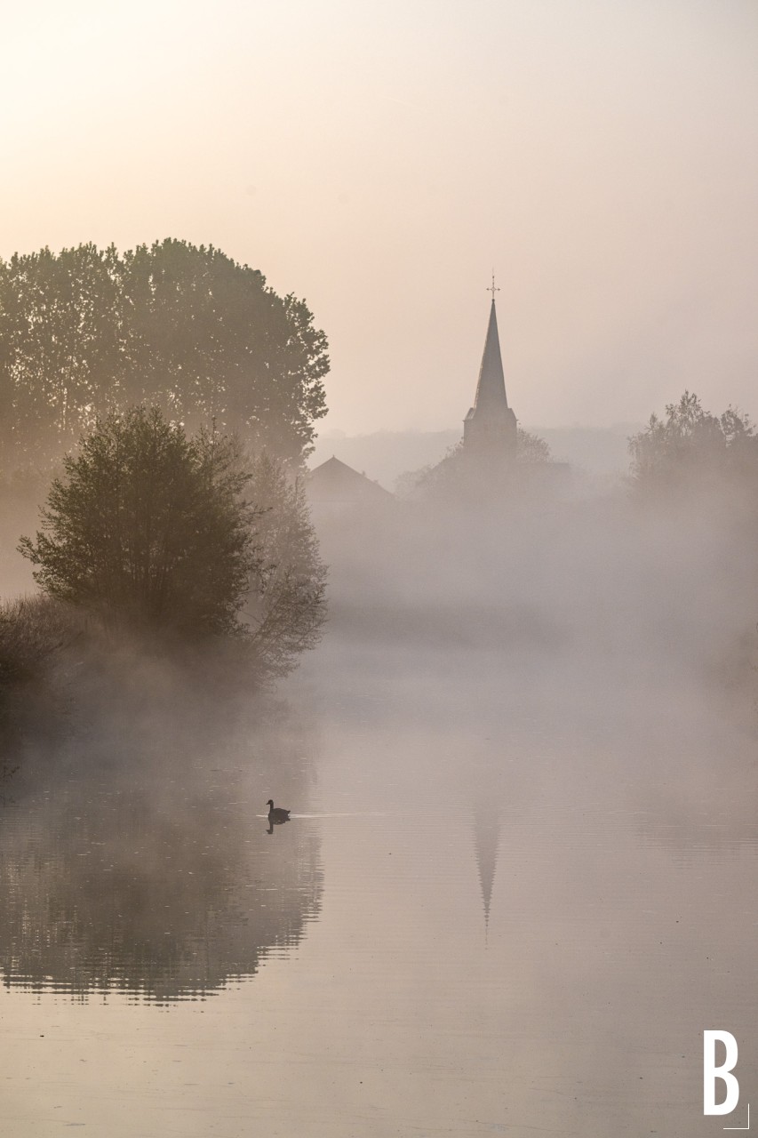 De Dender bij Idegem en Grimminge tijdens een mistige zonsopgang.