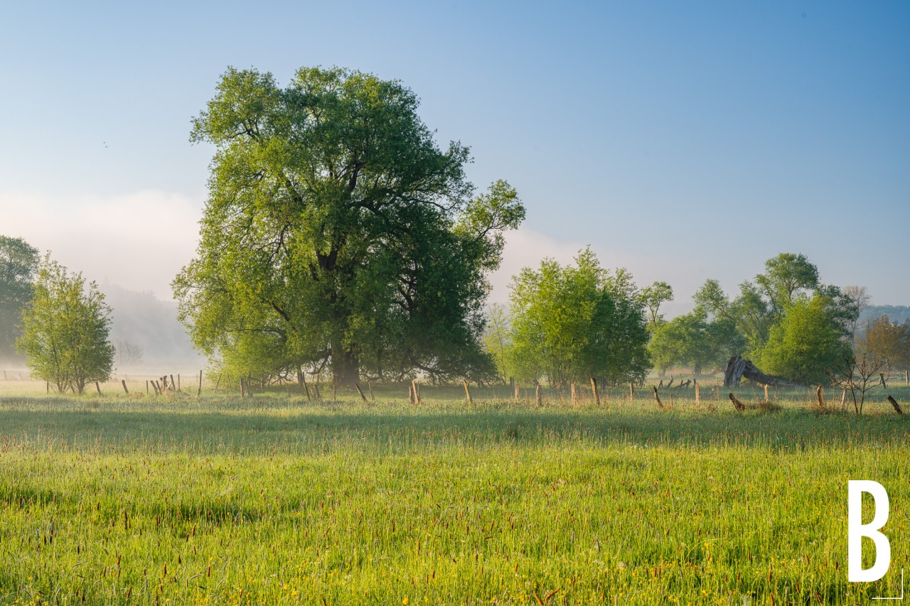 Zicht op de drassige weilanden tijdens de vroege ochtend.