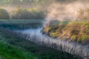 Luchtopname van de brug over de Demer tijdens een mistige lenteochtend.