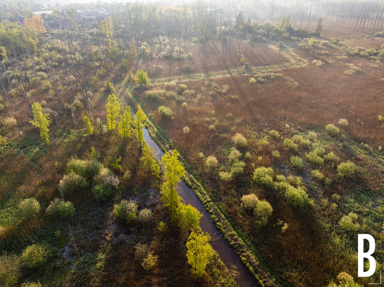 Luchtfoto van de natuurlijke wateropvang in de Dijlevallei.
