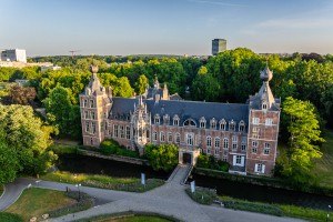 Detailopname van de historische gebouwen nabij het kasteelpark.