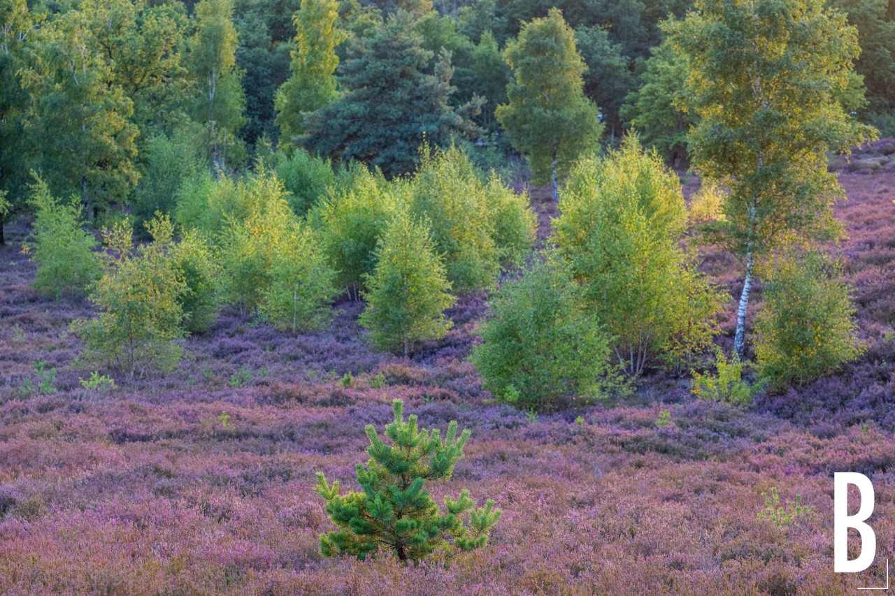 Zomers heidelandschap in het zachte licht van de ondergaande zon.